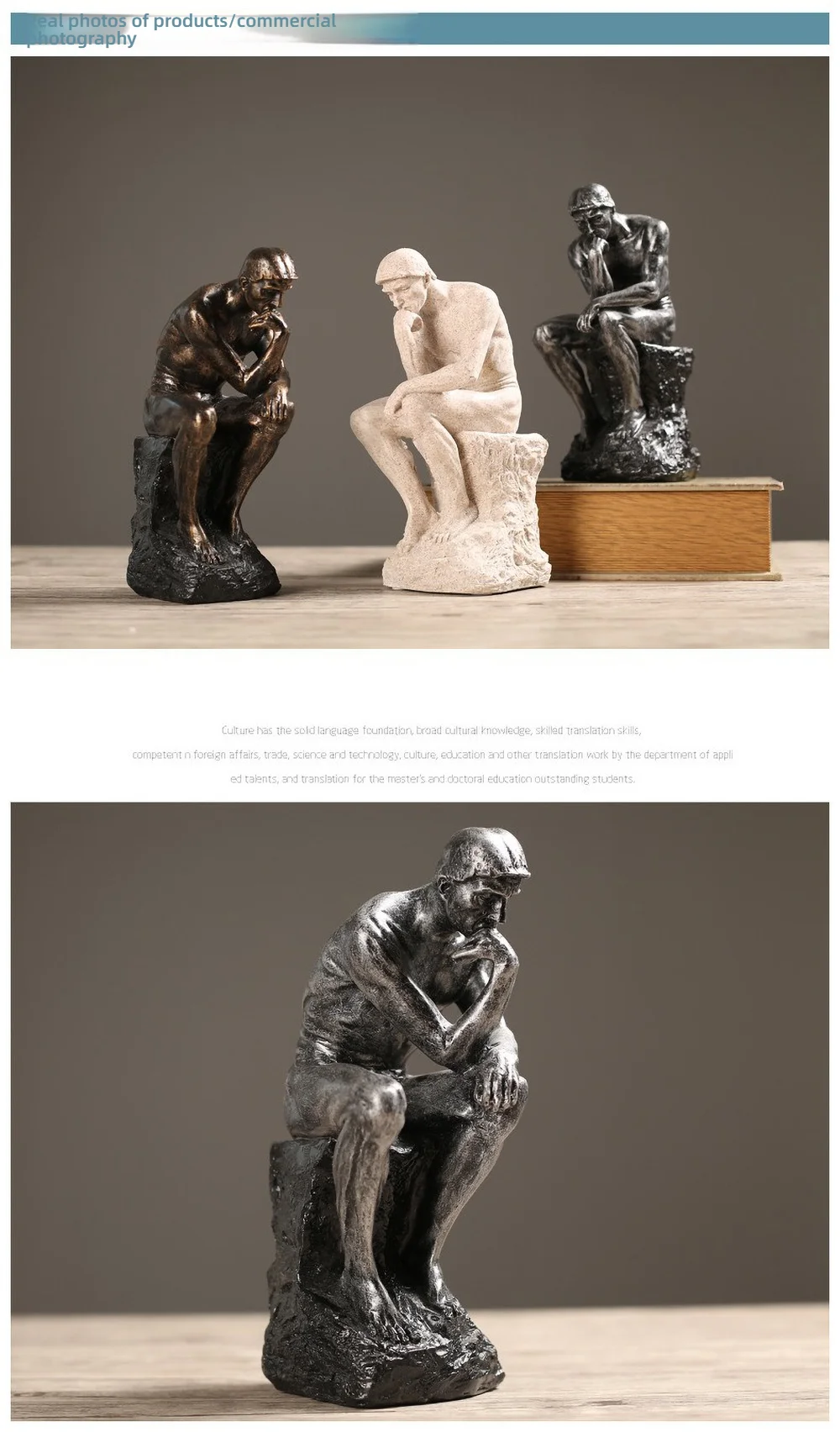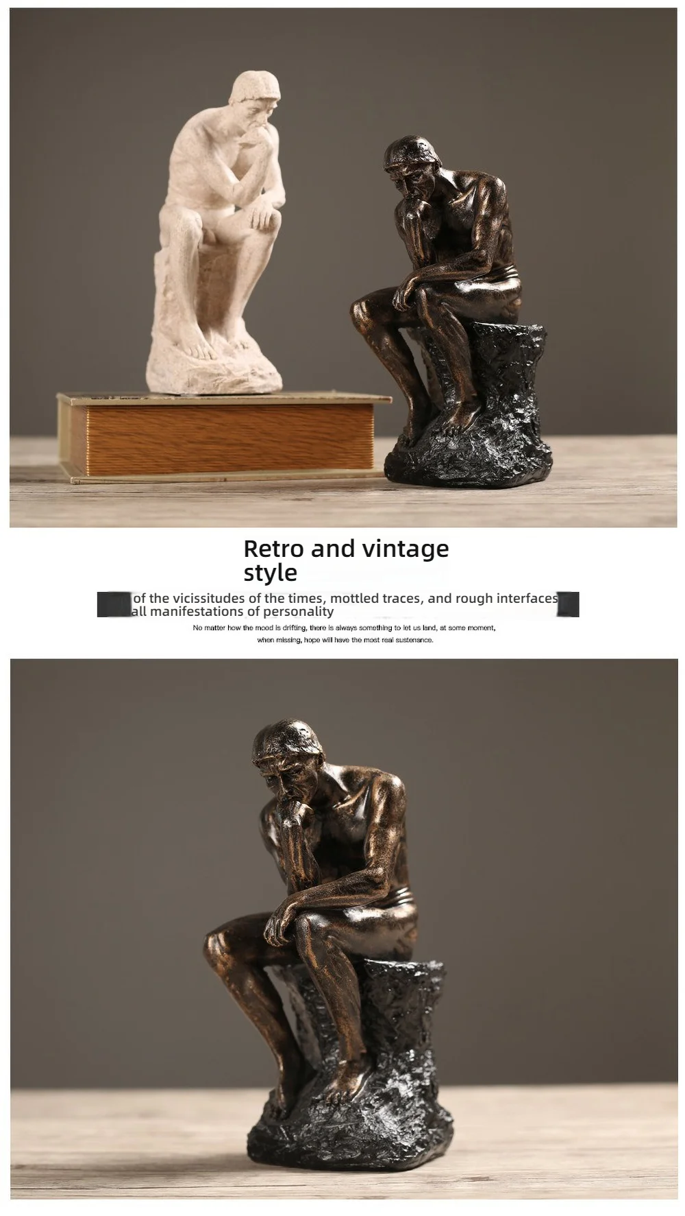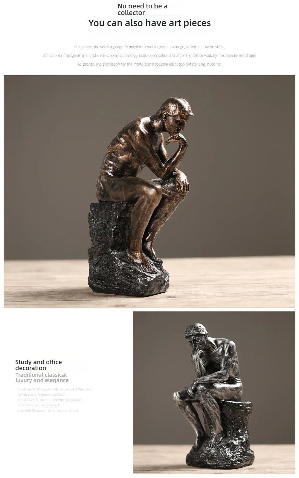 Invoke a moment of reflection in your home with a timeless symbol of intellectual depth. This set of three sculptures reimagines the iconic "Thinker" through distinct metallic and stone-like textures, offering a sophisticated contrast of bronze, sand, and silver. You can arrange them together or across different spaces to create a cohesive, curated atmosphere that celebrates quiet contemplation. Transform your office or living area into a sanctuary of modern philosophy.